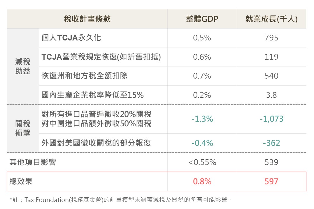 對美國而言,儘管調升關稅猶如七傷拳,對外施壓的同時,美國自身也需承擔潛在的報復風險。然而,根據美國稅務基金會預測,綜合考量減稅政策帶來的經濟助益與關稅提升造成的負面影響後,新稅收計畫仍預計對美國的長期GDP產生正向效應。