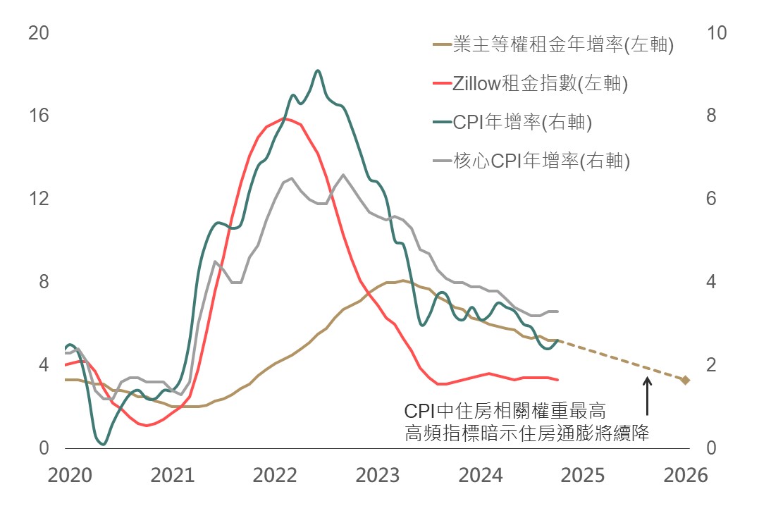 聯準會動向亦為二O二五年關鍵;聯準會對通膨率持續降至2%保持信心,且目前住房通膨仍維持放緩。然而,川普2.0紅潮下的保護主義增添美國通膨上行風險,一來是關稅成本將轉嫁給消費者;其次,驅逐相對低薪的非法移民可能衝擊勞動市場,加劇通膨風險。綜合來看,二O二五年的美國通膨將延續下行趨勢,但僵固的壓力漸增使得聯準會降息之路更加顛簸。