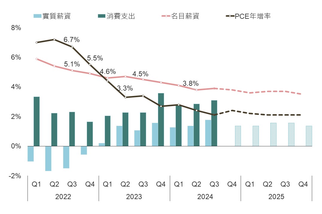 ▲ 美國實質薪資及消費支出趨勢(年增率)