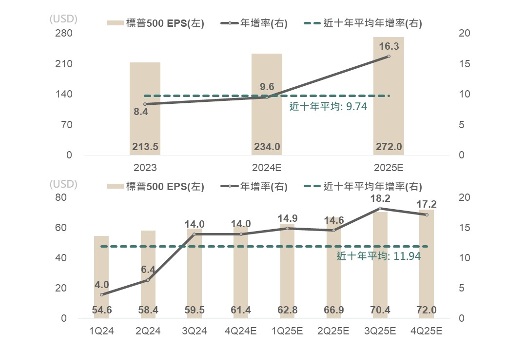▲ 標普500年度(上) / 季度(下) 預估EPS及年增率