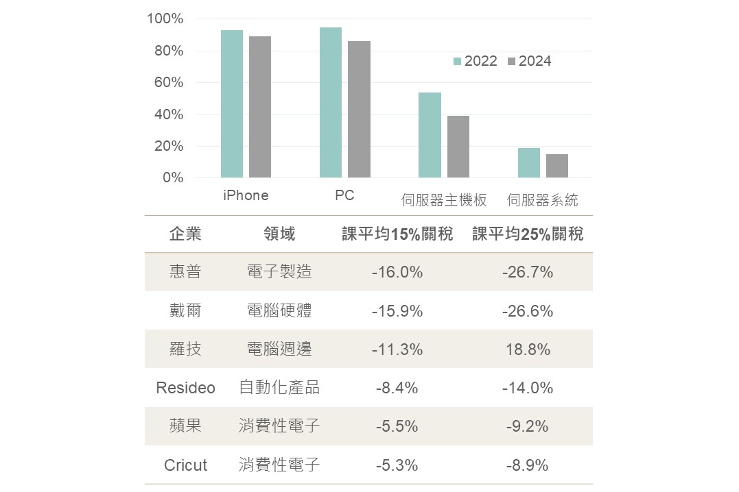 玉山銀行投資研究中心預估,美中關稅政策調整將對中國為主要生產地的消費性電子業影響較大。以iPhone為例,儘管供應鏈持續移轉,然中國完善的產業生態仍使轉移進度受阻。J.P. Morgan預測,即便到2027年iPhone中國生產占比仍高達79%(二O二四年為89%),消費性電子企業EPS恐面臨5%-25%衝擊。