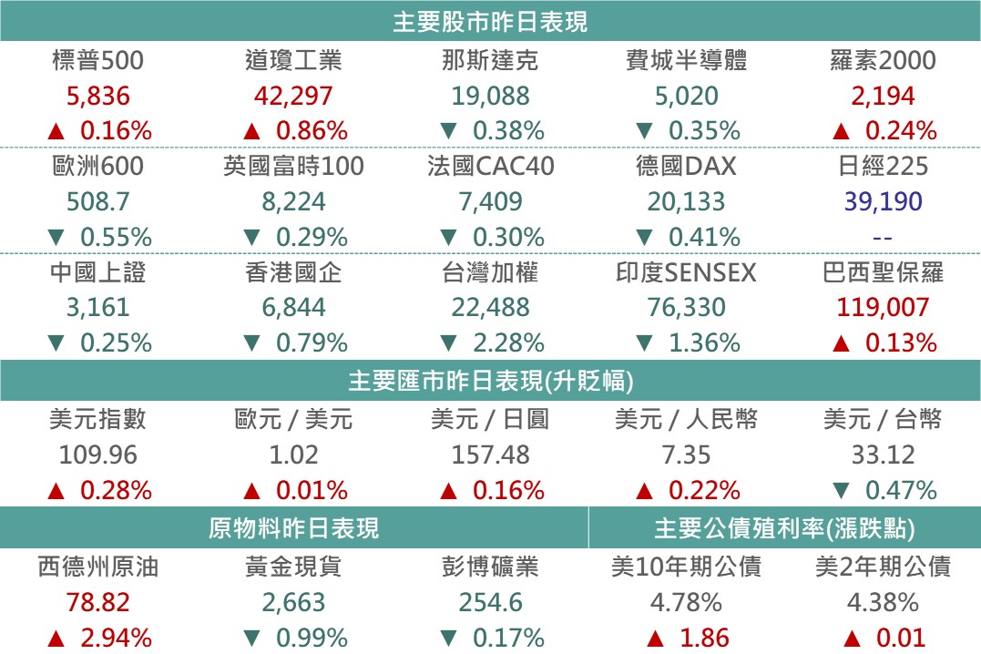 市場亦觀望新任政府之政策不確定性,皆促使近期金融市場之交投轉趨保守;儘管歷經上週五之修正後,昨日美股開低走高呈現反彈,惟昨日拜登政府宣布擬再進一步收緊對AI及晶片之出口管制,促昨日科技類股表現相對弱勢,標普500指數反彈收高,那斯達克及費半指數收低。