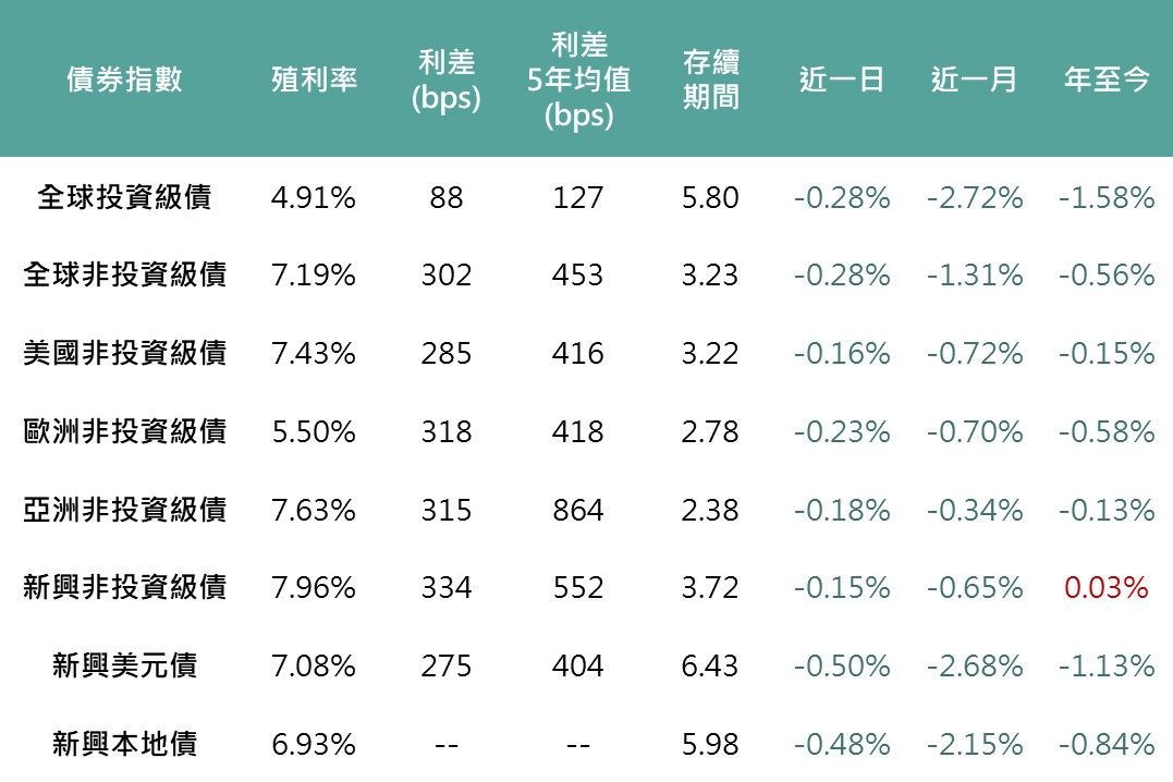 昨日市場延續上週五美國非農數據強韌,加上紐約Fed調查顯示美國消費者對短期通膨之不確定性有所增加,且本週美國也將公布12月CPI數據,市場對通膨風險擔憂,持續推升美國十年期公債殖利率走揚至4.78%,而各債種隨公司債大量發行,使債券利差擴大,拖累包含全球投等債下跌0.28%、美國非投等債下跌0.16%、新興美元及本地債受新興貨幣兌美元回落影響,分別下跌0.5%、0.48%。