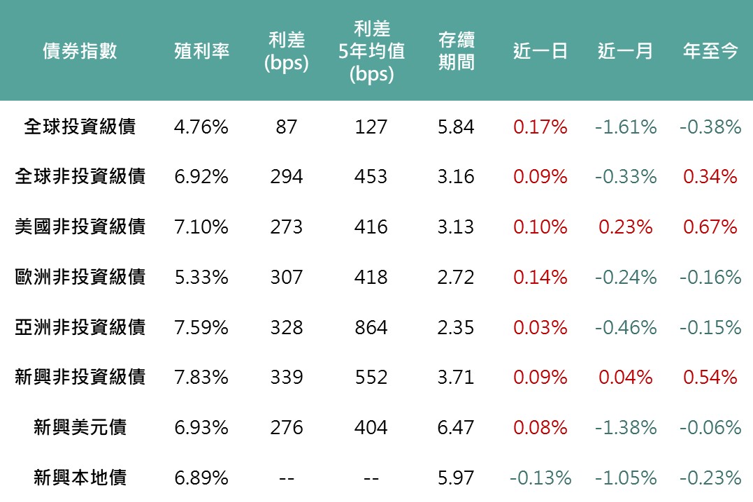 儘管美國零售銷售穩健成長,然市場延續前一天通膨數據低於預期的樂觀氛圍,疊加Fed官員Waller發表支持降息的言論,促美債殖利率持續回落,推動各債種普遍上揚,全球投等債上漲0.17%、全球非投等債上漲0.09%、新興美元債上漲0.09%,新興本地債方面,由於臨近川普上任時間,市場降低對拉美地區的曝險,促拉美貨幣貶值拖累新興本地債,使新興本地債下跌0.13%。