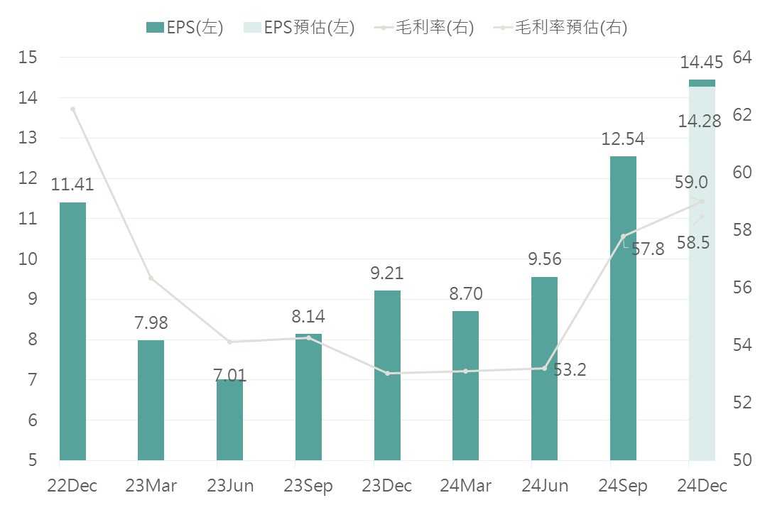 毛利率59%皆優於市場預期(14.28/58.5%),全年EPS 45.25 創下歷史新高,且先進製程比例已達74%,顯示AI帶動之晶片需求;展望方面,鑒於強勁之AI需求,AI相關營收在2024年已成長2倍後,預料2025年可望再翻倍,帶動整體營收有望年增20%;市場關注之