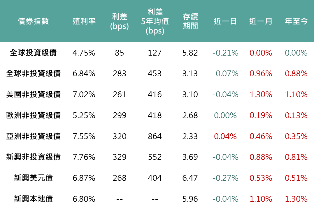 昨日川普於經濟論壇中要求多國加大對美投資、並要求歐洲放寬監管等,若不遵循即加徵高額關稅,另一方面,要求Fed必須降低利率,整體言論促使昨日美債殖利率曲線陡化(短天期公債殖利率下滑、長天期公債殖利率走升),美國10年債殖利率升至4.64%,而各債種在殖利率攀升影響下受到壓抑,全球投等債下跌0.21%、美非投等債下跌0.04%、新興美元及本地債分別下跌0.27%、0.04%。