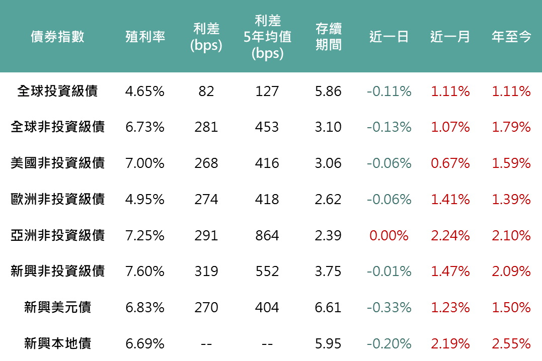 聯邦債務上限問題被解決之前,暫停或放緩縮表,提振美國公債上漲,美國10年期公債殖利率回落1.76bps,收4.53%。儘管昨日美國公債呈現上漲,然而各債種表現因利差擴大普遍下跌,美國非投資級債指數、新興美元債指數分別下跌0.06%、0.33%。新興本地債方面受關稅消息影響,新興貨幣兌美元走弱,跌0.2%。
