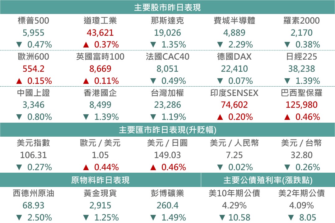 市場對美國經濟之疑慮升溫,促昨日美股主要指數延續跌勢,對Fed貨幣政策放寬之預期以及避險買盤則推升債市,10年期美債殖利率跌破4.3%水準。整體而言,交投氛圍趨向謹慎,市場亦尚在觀望川普政府之貿易政策動向,以及即將於週三美股盤後公布之輝達財報結果。