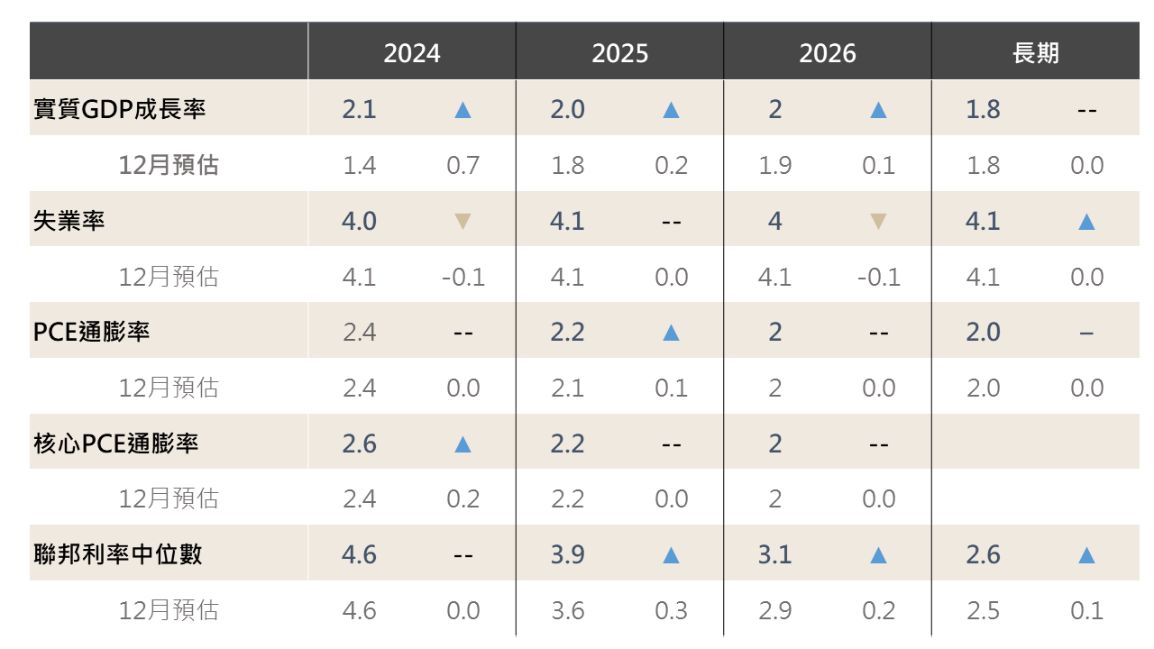 SEP上調2024-2026年GDP預估經濟預估摘要(SEP)中,Fed大幅上修2024年GDP年增率預估(1.4→2.1%),其餘預估值變動幅度不大。