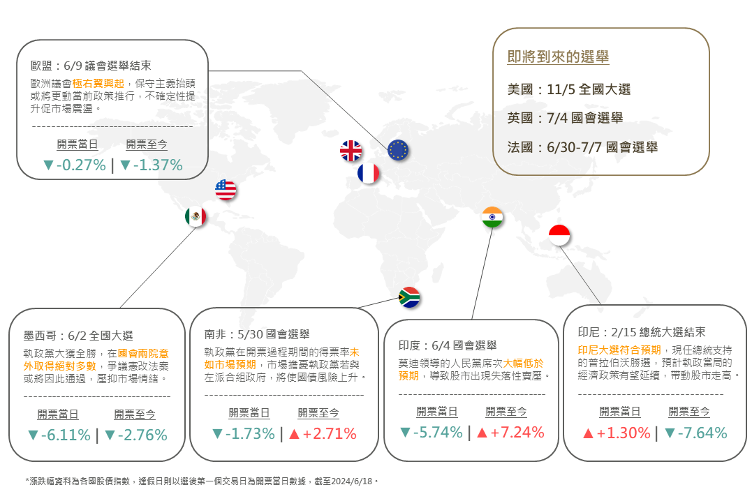今年上半年,全球各國的大選結果頻頻出人意料,對市場情緒和政策走向產生重大影響。墨西哥國會的憲改法案、南非的國債風險以及印度執政黨席次不如預期所導致股市的失落性賣壓,都成為市場波動的導火線。歐洲議會的右傾風潮和美國共和黨的領先優勢,顯示出全球保護主義的崛起,增加了政經局勢的不確定性。