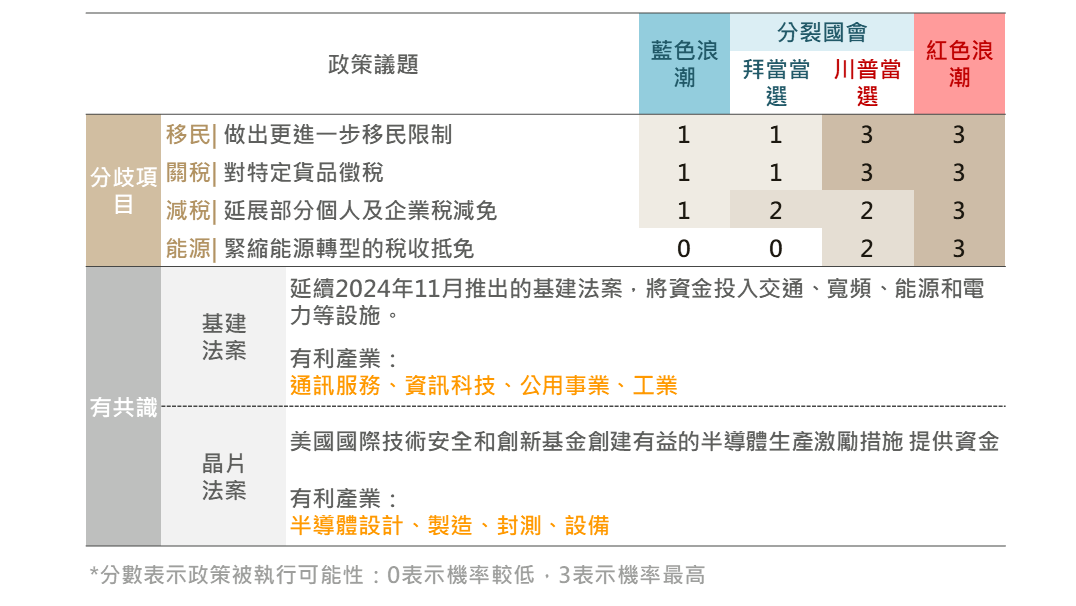 美國大選選情同樣激烈。近期民調顯示,川普為首的共和黨暫時領先,反映了反移民及貿易保護主義的興起。摩根士丹利的分析指出,若共和黨全面執政,將推出更嚴格的移民限制、擴大關稅規模、延續減稅政策及放寬環保法規,這些措施或許將對美國政經情勢增添更多不確定性。