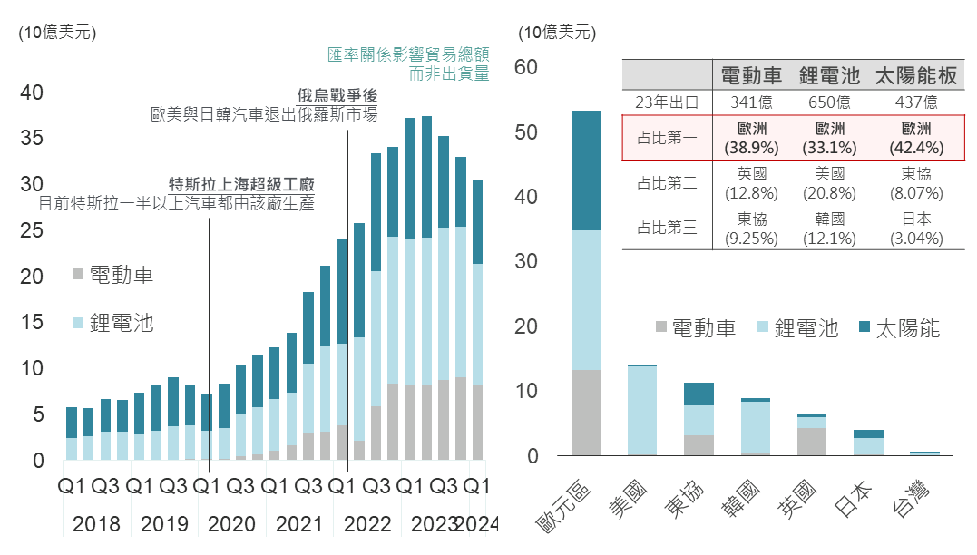 儘管歐美各國在政策上存在分歧,但在對中國態度以及科技產業的發展,態度卻是一致的。中國政府大力補助下的電動車、鋰電池和太陽能板產業已達到規模經濟,並在全球市場占據領先地位。近期美歐對這些領域的中國出口產品加徵關稅,雖然對中國經濟的影響有限,但也進一步限制中國的經濟發展,同時為全球經濟增長帶來了挑戰。