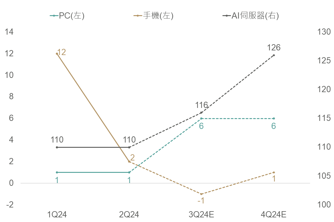 在輝達的帶動下,AI浪潮席捲全球,推動上下游相關產業股價成長,進而帶動全球股市擴張。然而,隨著全球股市不斷創下新高,市場不確定因子也開始慢慢浮現。聯準會的政策拐點、通膨基期降低後的僵固風險、全球保護主義再次抬頭以及下半年美國選舉的來臨,都增加了股市震盪風險。儘管如此,AI新應用的推陳出新,仍有望帶動終端設備銷售,2024下半年便在這樣的背景下揭開序幕。