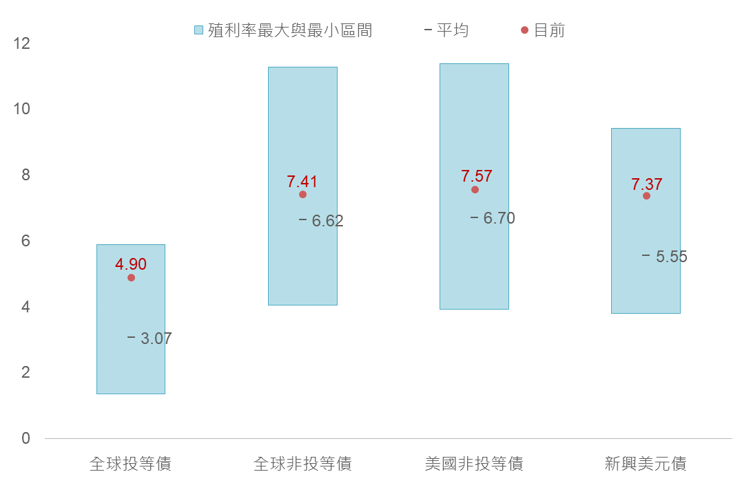 各債種殖利率分布-各主要債種殖利率仍高於2010年至今平均水準