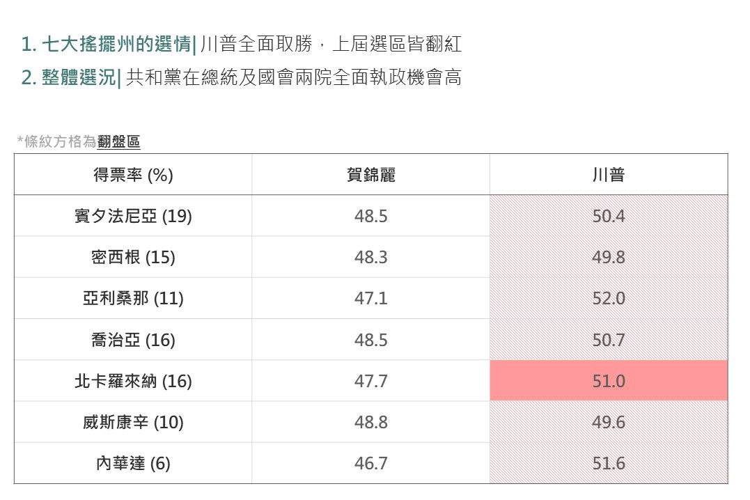 美國總統大選以共和黨勝選,川普奪得291張選舉人票並將重返白宮,而截至台灣時間11/7開票結果,國會選舉亦由共和黨領先,使大選形成紅色浪潮之機會較高。