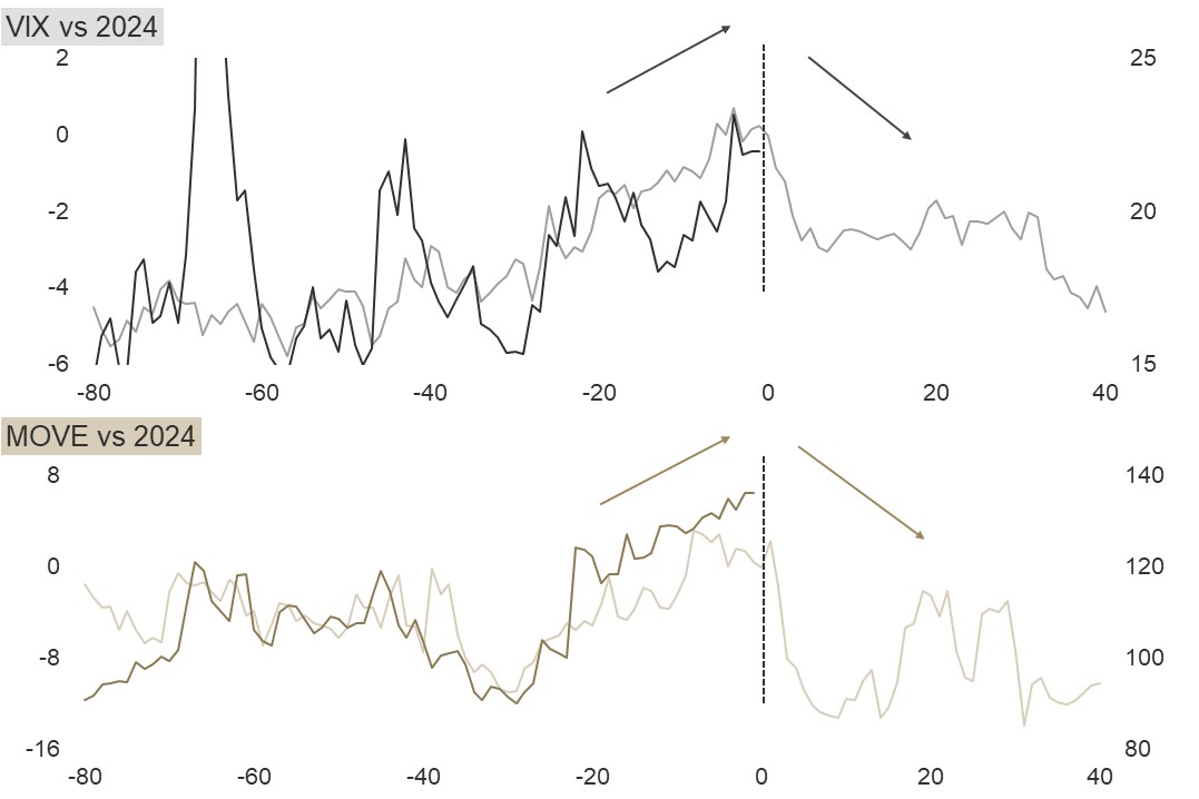 根據歷史經驗,股債市波動度於選前皆呈上升,惟市場波動度普遍因選後不確定性淡化而下降;觀察今年7月以來選前之VIX及MOVE指數皆有所上升,惟預期隨大選結果塵埃落定,金融市場短線有望因不確定性降低而呈現偏多走勢,後續市場交投或將續關注川普交易行情。