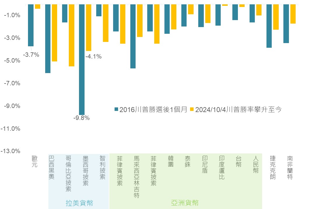 川普當選料支撐美元表現,儘管川普曾表達對美元走弱的想法,近期接受彭博採訪時也談論到美元太貴或影響美國的出口競爭力,惟其所主張的政策,如:加徵關稅、反對移民等評估將推動美元走強,參考歷史經驗,2016/11川普盪選後兩月內美元指數約上漲4%。
