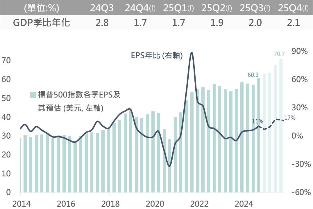 據彭博預估,美國GDP季比年化數據料於近2季落底(1.7%),於2025年起將呈現逐季回升;此外,標普500指數EPS預估料於未來4季擴張,其年比亦有望延續雙位數增長。整體而言,美股尚處擴張階段,雖預期川普之貿易政策將添市場波動,惟仍正面看待市場震盪上行