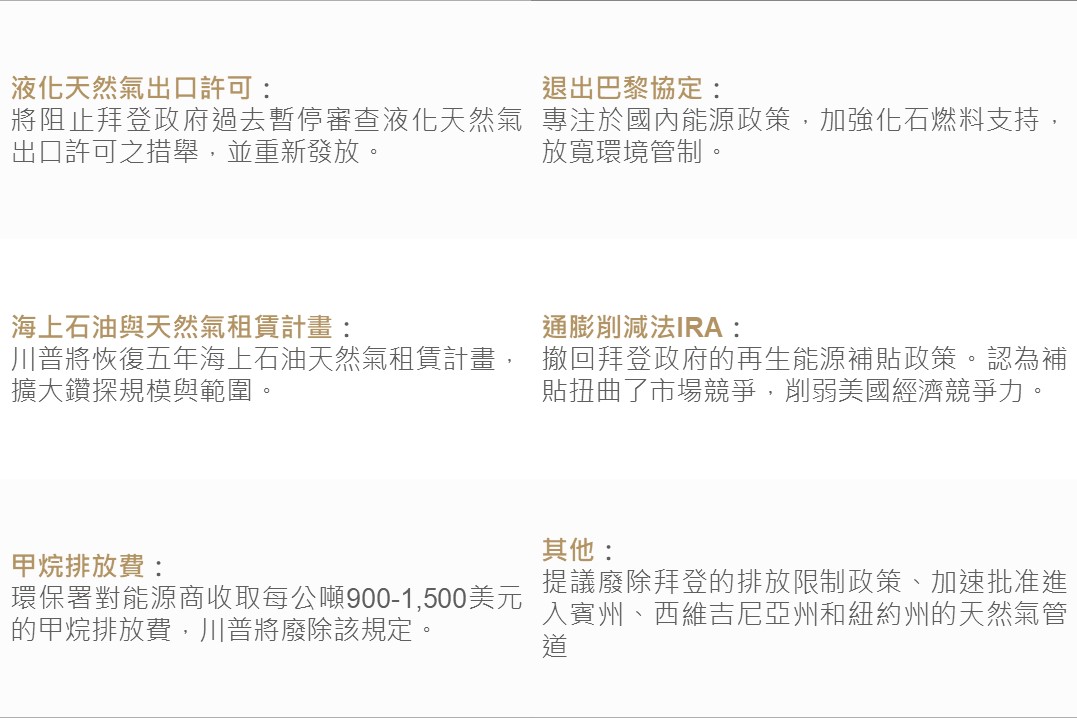 川普對傳統能源產業監管鬆綁有助減少油商合規費與提振廠商開採意願,評估對能源產業是一利多消息,將添類股上行動能。