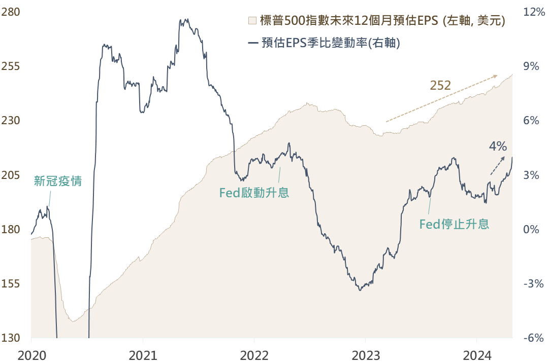 然以整體而言,普遍優於預期的現象除了反映美國經濟之擴張,亦顯示企業基本面強韌。而標普500未來EPS預估在渡過Fed升息循環後重回增長態勢,近一季已上修4%。儘管目前仍不排除市況於相對高檔或仍有修正可能性,然穩健之基本面料將提供支撐底氣。