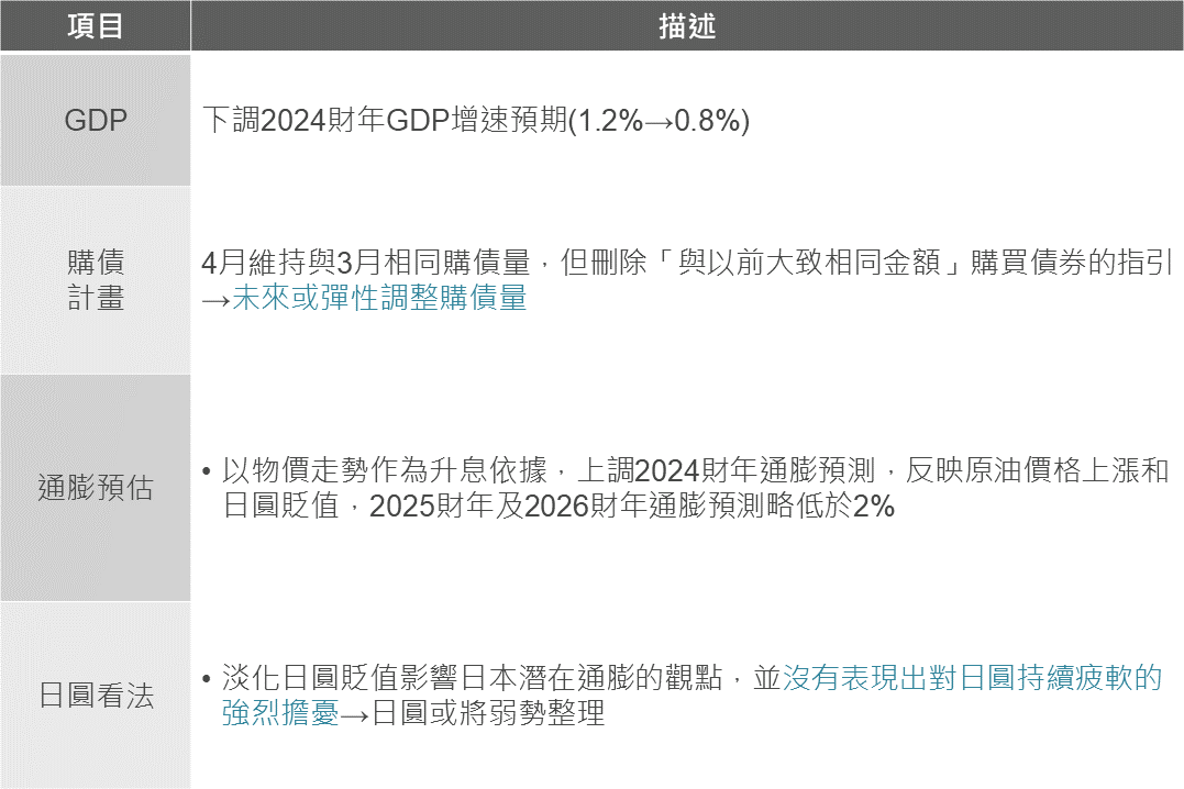 另一方面,日銀於上週召開會議維持基準利率在0-0.1%區間,符合市場預期。雖日銀表示若通膨朝日銀預測方向發展(中長期通膨朝2%目標邁進),升息將是合適的;然日銀總裁植田和男對升息的立場仍維持觀望,並淡化日圓貶值可能影響日本成本型通膨的觀點,也沒有表現出對日圓持續疲軟的擔憂。總體而言,日銀雖認為通膨風險偏向上行,但未給出未來明確升息時點,在鷹派程度不如預期之下,料日圓年內維持弱勢整理。