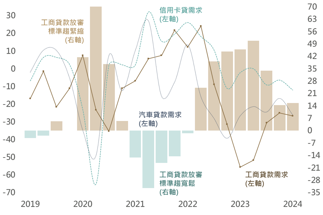 據Fed之資深核貸人員意見調查報告(SLOOS),雖自Fed停止升息以後,回報放貸緊縮之銀行呈現邊際減少;然截至Q1,美國中、大型銀行對工商貸款之放審標準仍處緊縮區間(指數自14.5略升至15.6),且觀察工商貸款及消費性貸款之需求依然呈現疲弱態勢,皆反映Fed之政策利率仍持續壓抑需求。