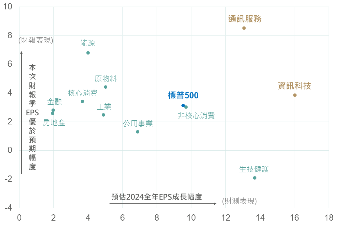 在科技類股方面,截至5/8,約86%之S&P500企業公布財報,其中科技類股財報表現亮眼,優於預期比例87.5%,優於整體S&P500之79%;EPS優於預期幅度亦屬前段班(3.9%,優於S&P500之3.1%)。至於財測方面,即使部分科技公司提及總經不確定性仍高,以致後續需求較保守看待,不過據彭博預估2024全年資訊科技及通訊服務之EPS成長幅度皆居前(16%/13%),顯示科技類股獲利成長動能仍存。