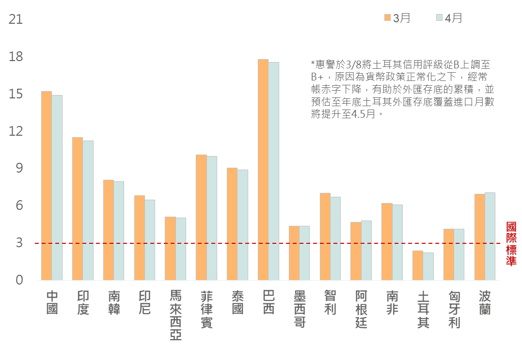 在債券方面,4月經歷美國通膨僵固促市場收斂降息預期推動美元走強,新興國家貨幣普遍貶值,促部分新興國家央行出手干預匯市,反映在4月外匯存底覆蓋進口月數大多呈現小幅下滑,然而普遍大於國際標準3個月,顯示各國央行透過消耗外匯存底阻貶後,外匯存底仍足以應付進口需求,故評估新興市場基本面尚屬穩健,有利新興美元債後續表現。