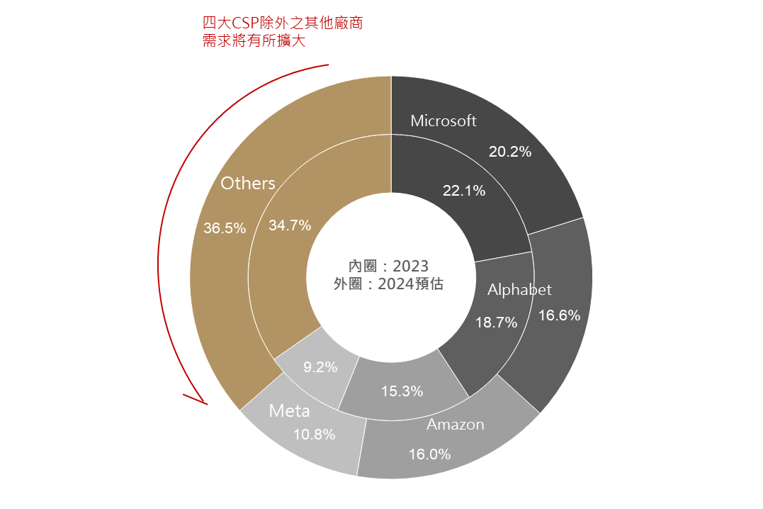 主要科技軟體大廠(Microsoft、Alphabet等)上季財報皆提及有鑑於滿足雲端和AI產品持續成長的需求,今年資本支出將顯著增加來擴展AI及相關基礎設施,且部分公司財報顯示AI雲端營收占比逐漸提升下,或將帶動整體高階AI伺服器需求將會由前四大雲端服務業者(CSP)逐漸擴及到其他業者,根據大摩預估2024年全球資本支出年增率也由原先26%上修至44%,有望使得整體AI伺服器需求進一步獲得提振。