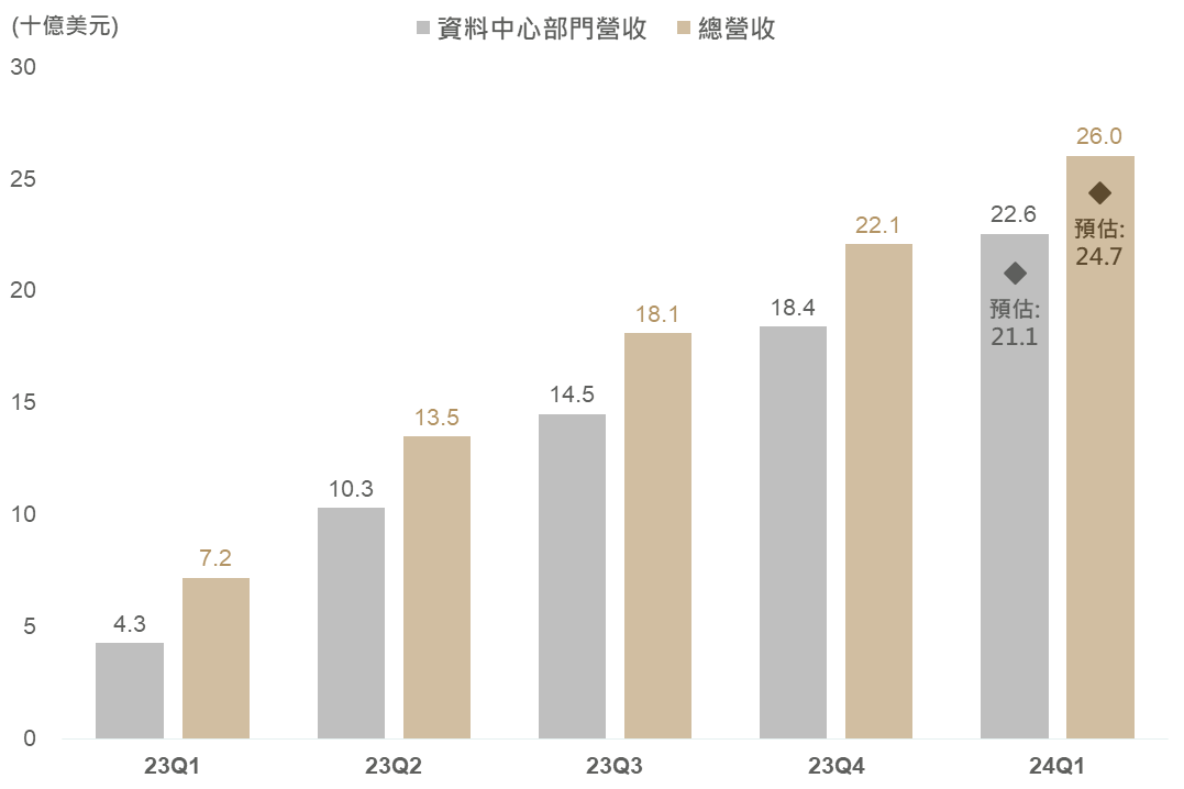 總營收/資料中心營收: 260/226億美元 (彭博預估: 247/211億美元)