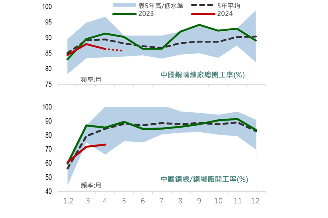 ▲ 中國精煉廠與銅線(銅纜)加工廠開工率