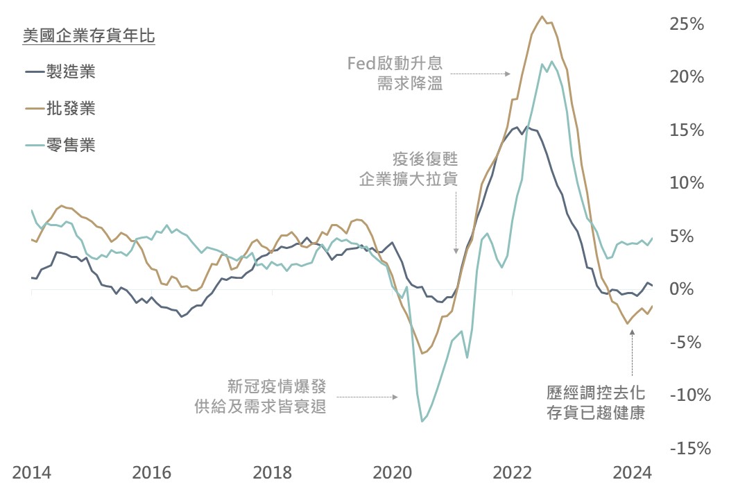 據美國普查局數據,4月美國製造業/批發業/零售業存貨年比分別為0.4%/-1.6%/4.8%。整體而言,企業自2022年即進入存貨調控階段,而在歷經數季的去化後,目前企業存貨已降至相對健康水準;在此情況下,料隨後市經濟趨於回升,供應鏈亦有望重啟拉貨補庫之行情。