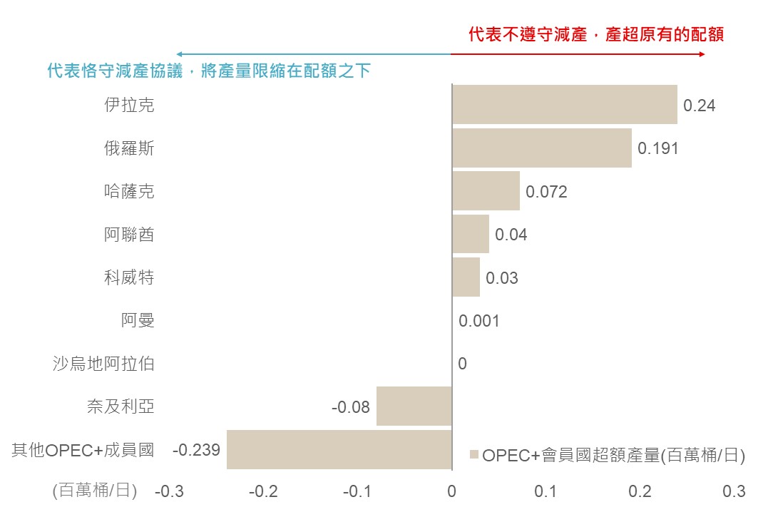 ▲ OPEC+會員國超額生產額度(百萬桶/日)