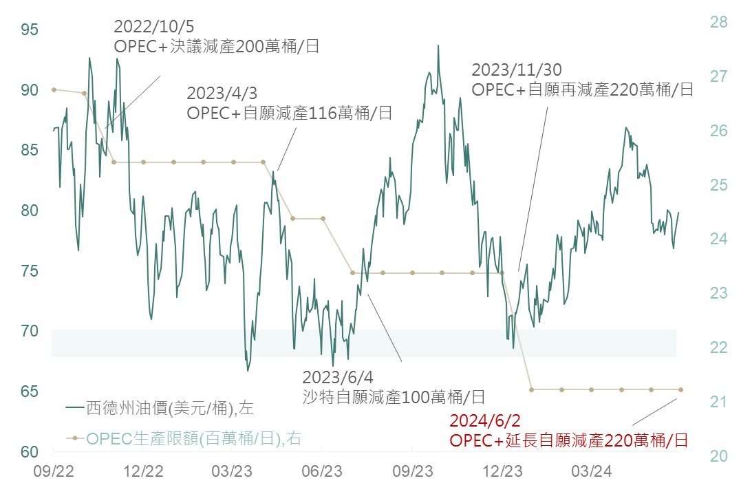 ▲ OPEC+減產政策與西德州油價關係圖