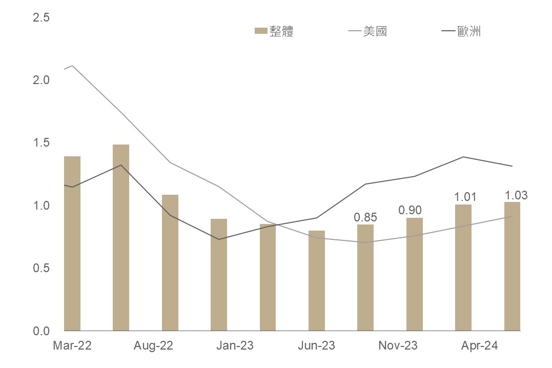 美、歐5月綜合PMI初值為54.4、52.3,皆較上月回升且高於市場預期,反映今年以來主要國家經濟保持韌性,在此背景下,觀察Q2整體公司債升降評比率回升至1.03倍,連續4季回升,且今年來整體公司債升評數已大於降評數,評估在目前全球經濟仍保持穩健下,也同步支持企業整體債信體質。
