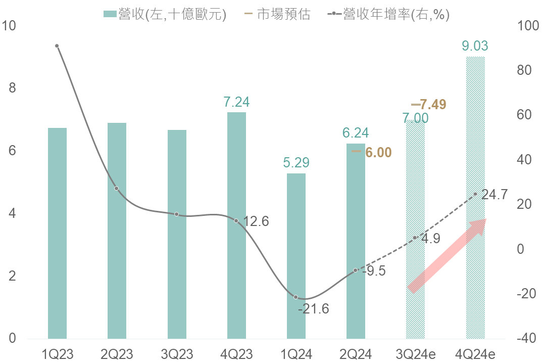 艾司摩爾24Q2營收為62.4億歐元、新訂單金額/先進製程EUV訂單分別為55.7/25億歐元,皆高於市場共識;然Q3財測方面,營收及毛利率中位數(70億歐元/50.5%)不及市場預估之74.9億歐元及51.1%,但對2024全年展望則保持不變,即代表2024全年營收將與去年持平,依財測回推H2營收將逐步成長(Q3/Q4營收年增率: 4.9%/24.7%),顯示半導體基本面復甦腳步未變,惟短期受政治風險升溫而擴大波動。