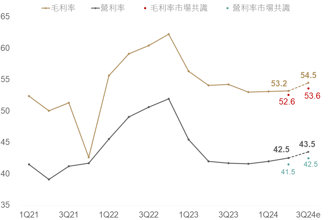 展望方面,下季營收預估介於224-232億美元,季增約9.5%,其中毛利率(53.5-55.5%)展望優異,且上調全年營收展望(自21-26%上修至24-26%)及資本支出下緣(由280-320億美元上修至300-320億美元)。管理階層提及AI為未來主要成長動能,CoWoS產能即使今年已經翻倍且明年將再度翻倍,仍然將供不應求至2026年,而高階手機需求前景亦較前三月好,綜上評估基本面在AI趨勢之下仍具潛在成長空間。