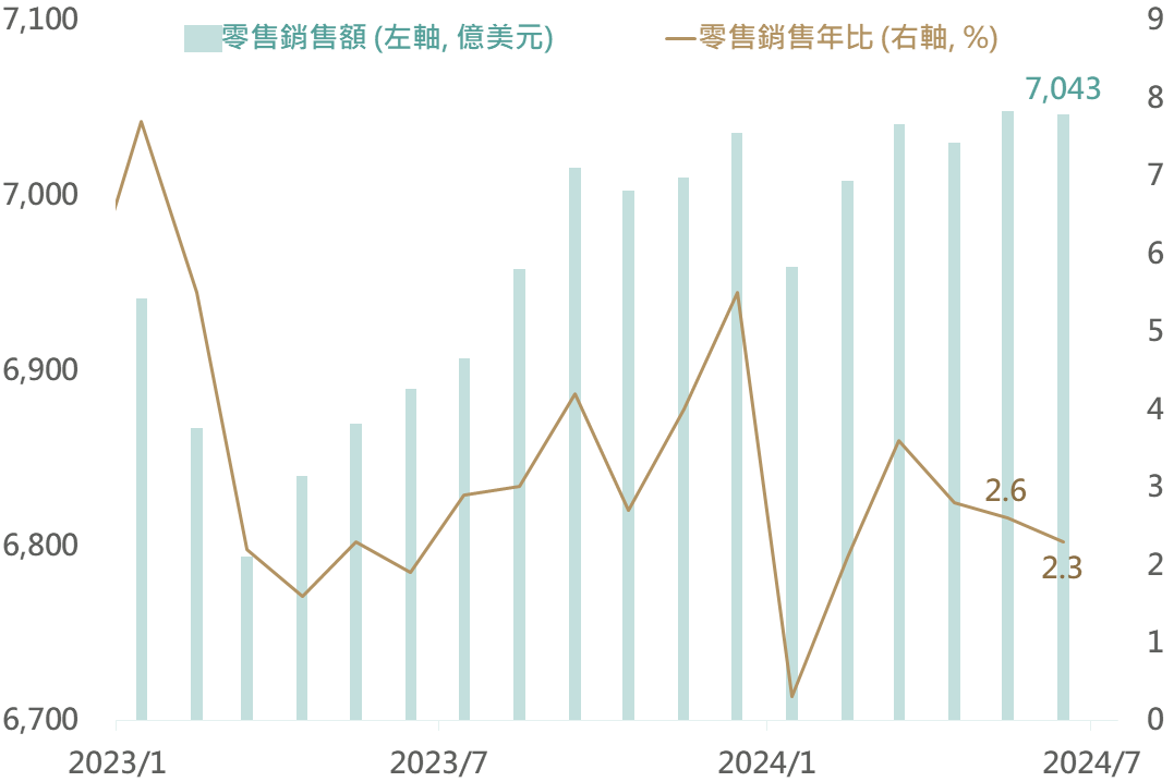 美國公布6月零售銷售數據,儘管其年比自2.6%降至2.3%,然觀察其月比持平(0.0%)優於市場預期的-0.3%,前值亦自0.1%上修至0.3%;此外,不含汽車及汽油的核心零售銷售月比達0.8%,明顯優於市場預期的0.2%。評估雖增長動能有所放緩,然美國消費力仍足具韌性。