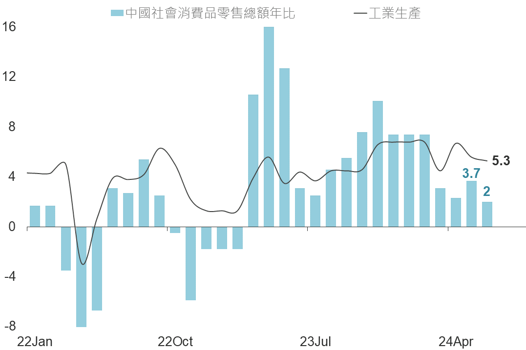 較弱的為房地產及消費,經統計儘管一線城市銷售面積一度在政策刺激下彈升,然最新數據再度轉為負增長、1-6月份的新建商品房銷售面積及銷售額年增率分別為-19%、-25%;零售銷售則是再度放緩至僅年增2%,搭配先前通膨數據仍顯示通縮疑慮,中國消費未有起色。