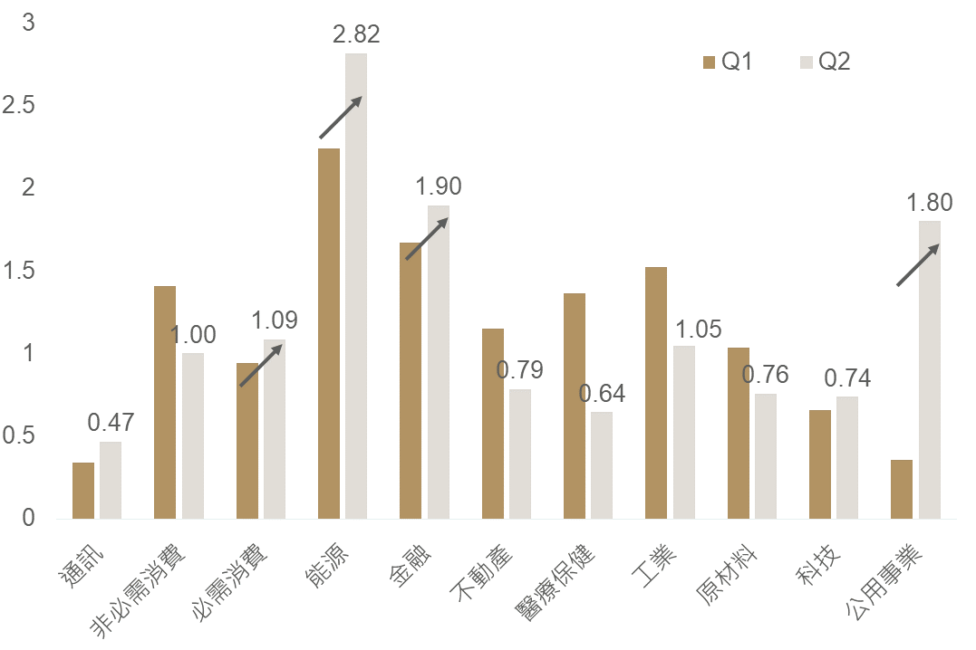 觀察Q2各產業債升降評比率,能源、金融、公用事業、必需消費相較Q1持續回升,若考量目前川普當選機會提高,能源(傳統能源)、公用事業(基礎建設)、金融等產業有望受惠,建議投資債之產業選擇,可以目前債信穩健、配合政策利多債種進行配置。