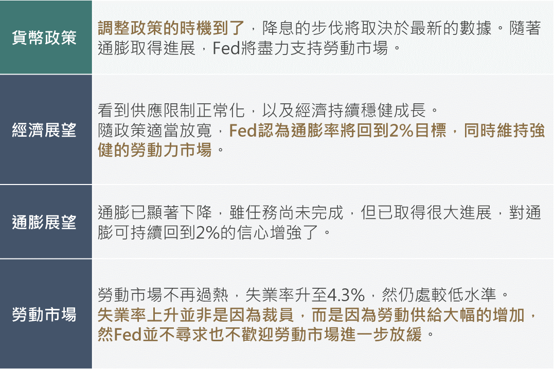 上週Fed主席鮑威爾於全球央行年會發表談話,其明確表示降息的時機已到,降息的幅度則取決於後續的數據。在總經展望方面,鮑威爾表示對通膨率回到2%之信心增強,並認為疫後混亂的供應鏈持續恢復起了關鍵的作用,通膨回落亦不代表經濟疲軟。此外,當前失業率的上升並不是因為經濟轉弱的裁員所導致,其主要是反映勞動供給的大幅增加;然而,Fed並不尋求也不歡迎勞動市場再更進一步降溫。