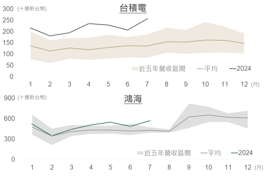 AI晶片龍頭輝達將於本週公布財報,觀察AI伺服器供應鏈中指標公司,上游(台積電)及下游(鴻海)Q2以及最近之7月營收皆創下歷史新高,且兩間企業近期法說會中皆表示AI產品之需求相當強勁,暗示本週輝達即將公布之財報料將延續亮眼表現,再次驗證AI長多趨勢將持續。