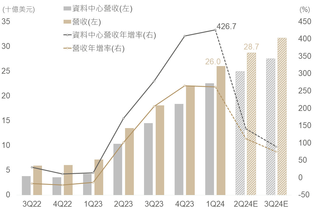 ▲ 輝達整體營收、資料中心年增率及預估