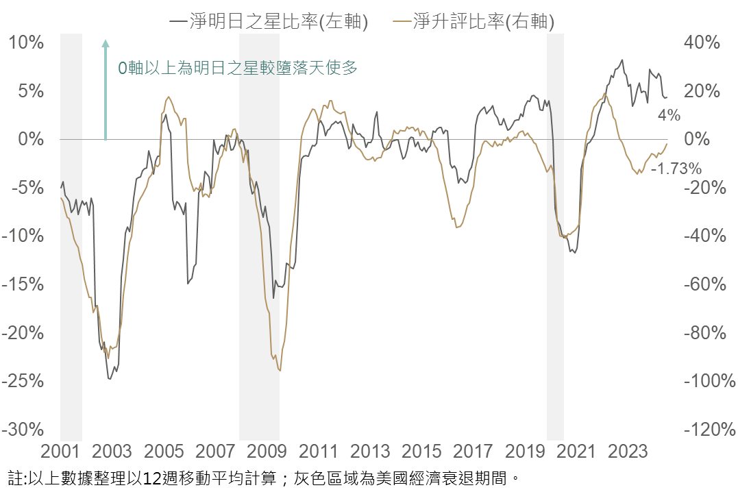 觀察歷史美國經濟陷入衰退時,非投等債淨升評比率與淨明日之星比率皆會大幅滑落,反映企業債信體質惡化,而近期美國經濟放緩,但非投等債之淨升評比率仍持續回升,而淨明日之星比率保持在0軸之上,顯示當前整體非投債企業債信體質仍保持穩健。
