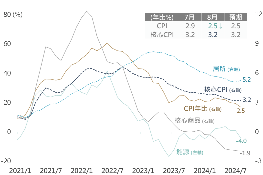 美國公布8月CPI數據,其年比自前月的2.9%明顯降至2.5%,為2021/3以來新低;8月通膨率走降主要來自能源項目之負貢獻(年比-4.0%),惟扣除食品及能源之核心CPI年比為3.2%與前月持平。觀察CPI各細項,包含食品、能源及商品類之通膨持續放緩,然服務類物價表現頑固,主要反映居所項(年比5.2%)相對具僵固性;整體而言,雖核心服務通膨之僵固性仍存,然整體數據顯示美國通膨狀況趨向獲控格局。