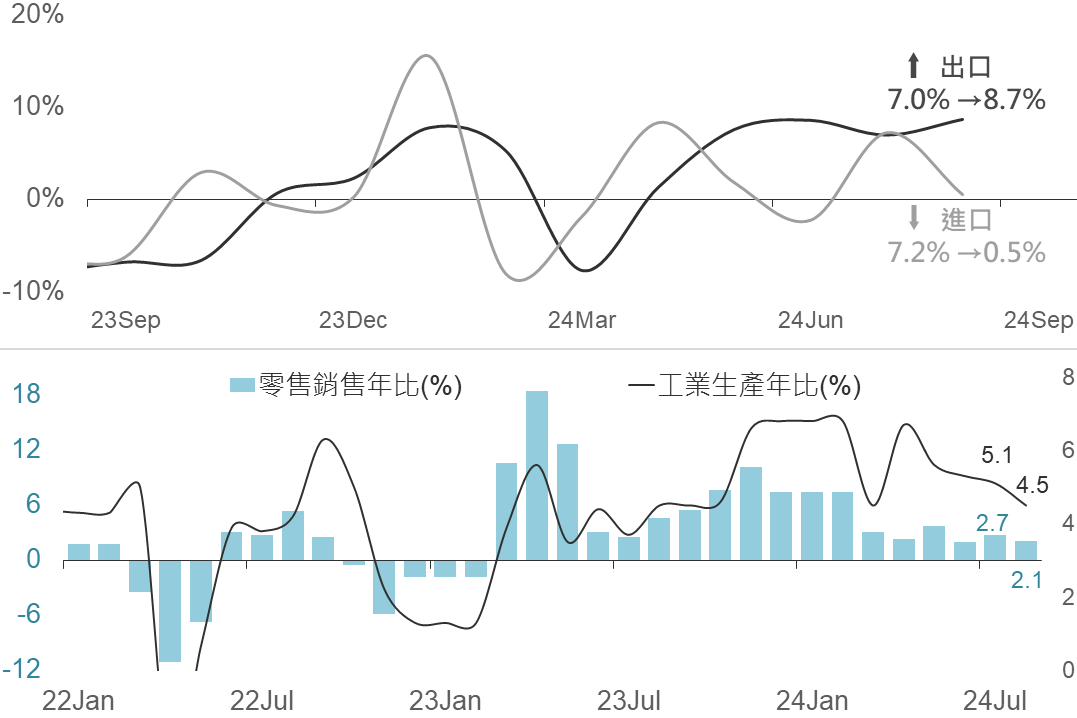 ▲ 中國進出口(上)/零售銷售及工業生產(下)