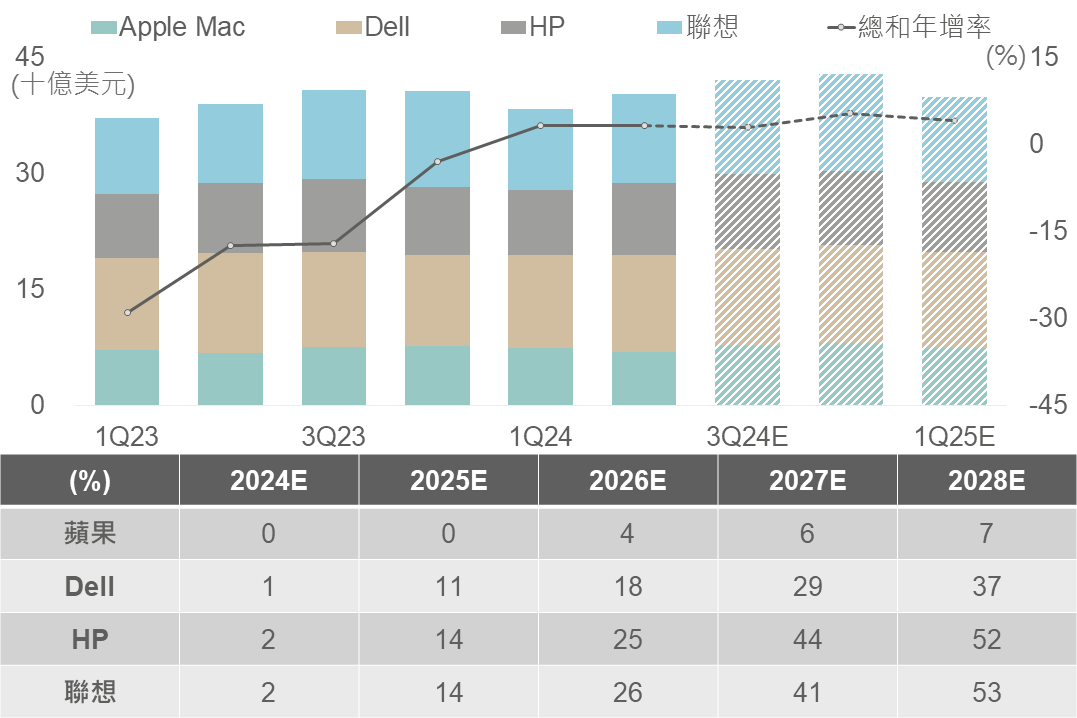 另外,隨消費者對AI PC持觀望態度,大摩預估AI PC今年營收占比僅低個位數,惟至2028年或超過50%,