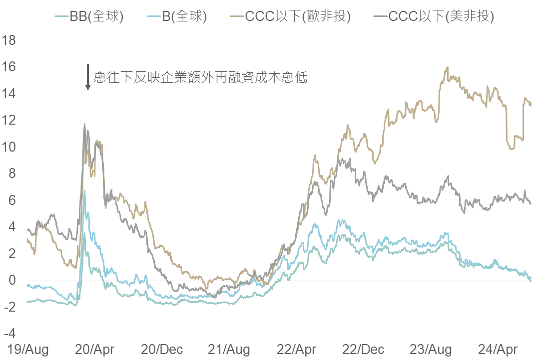 觀察非投等債各評級中除CCC級以下,BB、B級債券的額外再融資成本已大幅減少,接近2022年初水準,反映在當前歐美經濟趨緩但不至於陷入衰退之背景下,及對央行啟動降息信心增加,市場更為青睞評級較高之非投等債,促BB、B級債券殖利率下滑,並使