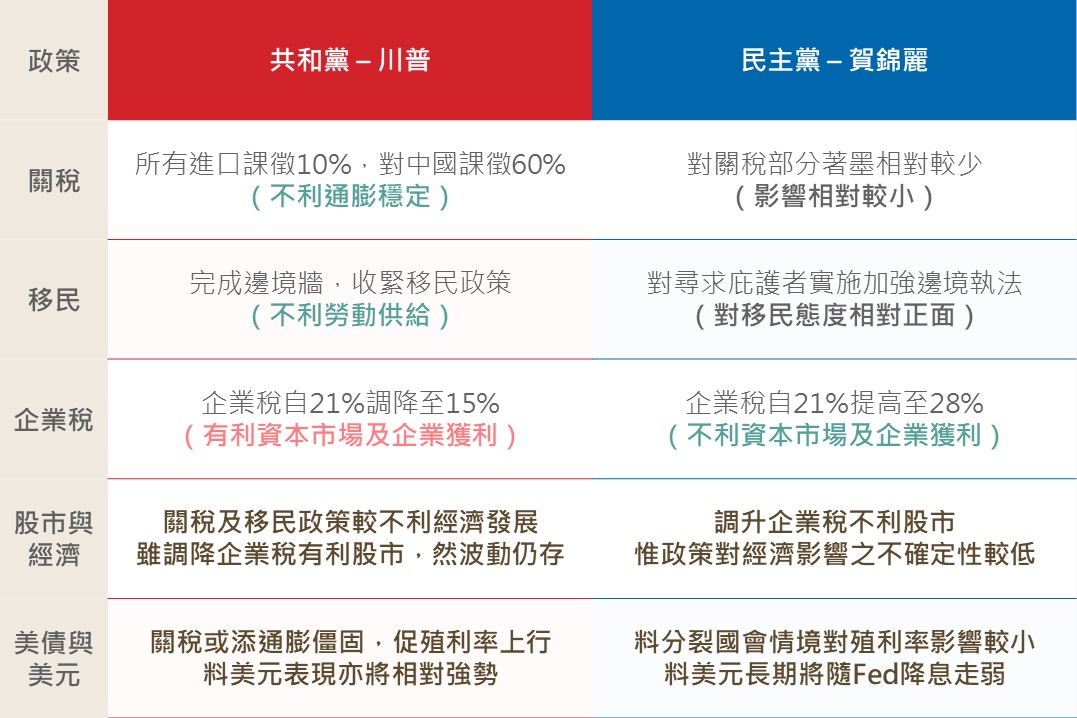綜合而言,短線市場將持續觀望選情變化,惟預期隨選後之不確定性消除,料將有利市場正面反應。若分析兩黨政策方向,川普擬調降企業稅至15%,賀錦麗則擬調升至28%,估前者將增加標普500企業EPS約4%,後者則約減少5%,故評估川普勝選對市場短線之激勵效果相對較大,惟因川普政策強調提高關稅及收緊移民,除了不利通膨穩定,亦將增添美國長期經濟發展之不確定性,故料市場波動亦將擴大。