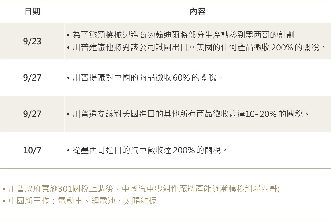 即將迎來美國大選之際,川普勝選預期提升帶動川普交易回歸,市場預料美國將對各國提高關稅,財政赤字亦將惡化下,全球股、債市場波動均擴大波動,並呈現能源、金融等受惠川普政策類股收高,而其不重視的替代能源等類股重挫之情況;與此同時,特斯拉財報優於預期,加上科技龍頭財報密集公布前股價預先上漲反應,亦促使科技股表現相對亮眼。